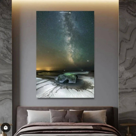Impression UV 7 couleurs sur un panneau composite d'aluminium de 3 mm d'épaisseur avec profilé en alu au dos pour l'accrochage (espace d'un centimètre le tableau du mur). Il est possible d'y adjoindre une caisse américaine pour un habillage complet du mur.