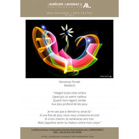 Oeuvre N°077/200, Danseuse florale _ Bordeaux _ Lightpainting Choix de la commande Tirage d'expo N° 0/5 (numéroté 0/5) Choix de l'encadrement Sans + 0 euros Choix des Dimensions 60x90cm