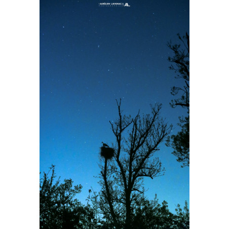 Photographie prise en 2022. Une pose longue de 15sec, d'une cigogne prise en bord de Garonne sous la grande Ourse.